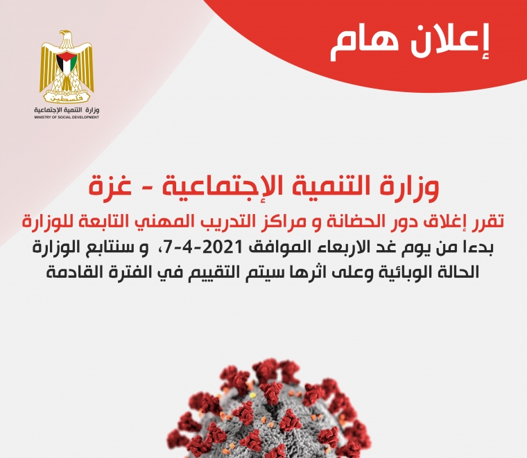 تعلن وزارة التنمية الاجتماعية انه سيتم إغلاق دور الحضانة و مراكز التدريب المهني التابعة للوزارة